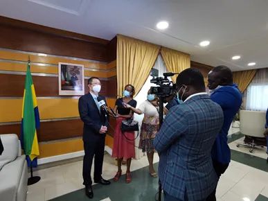 胡大使在会见后接受了加蓬国家电视台、加蓬24电视台等采访,介绍中加合作抗疫情况。